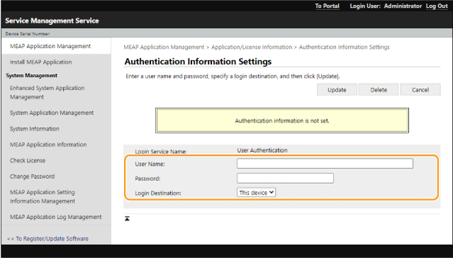 اگر برنامه ورود به سیستم تغییر کرد، اطلاعات احراز هویت را در [Set MEAP Authentication] دوباره تأیید کنید. ممکن است لازم باشد اطلاعات احراز هویت را دوباره وارد کنید.