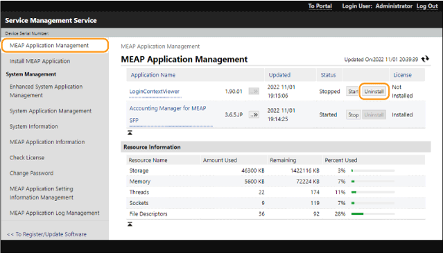برای حذف نصب برنامه، روی [MEAP Application Management]