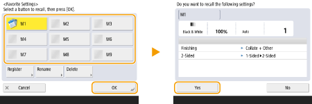 اگر می خواهید تنظیمات دلخواه را با وارد کردن کلمه عبور فراخوانی کنید، <No> را فشار دهید تا اطلاعات کلمه عبور حذف شود. (اگر تنظیمات دلخواه را اغلب در دستگاه های دیگر وارد می کنید، می توانید وارد کردن کلمه عبور را الزامی کنید تا از جعل هویت کاربران جلوگیری کنید.)