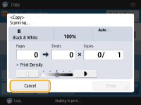(توقف) را روی پانل کنترل فشار دهید در حالی که صفحه ویژگی های اصلی کپی کردن نمایش داده می شود، کار کپی کردن متوقف شده، و پیام <StopSelect the Copy job you want to cancel.> و لیست کارهای کپی نمایش داده می شود. می توانید کار کپی را از لیست انتخاب کنید و آن را با فشار دادن <Cancel> لغو کنید.اگر با مدیریت تأیید اعتبار شخصی وارد سیستم شوید و پس از فشار دادن