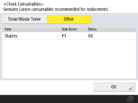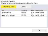 حتی اگر <Needs Rplcmt.> در <Remaining Days> نشان داده شد، تعویض را انجام ندهید تا این که پیامی در محل نمایش وضعیت (در پایین نمایشگر پانل لمسی) نشان داده شود که به شما اعلام کند که مواد مصرفی را جایگزین کنید.