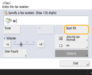 (خانه) <Fax> <On-Hook> <Start RX> را برای دریافت فاکس، انتخاب کنید.