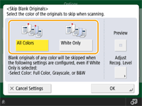 هنگام تنظیم روی <Skip Blank Originals>، فقط مقاصد نوع <E-Mail> یا <File> را میتوان مشخص کرد. اگر نوع مقصد روی موردی بهجز <E-Mail> یا <File> تنظیم شده باشد، نمیتوان ارسال را انجام داد.