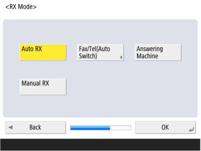 هنگام استفاده از فقط قابلیت فکس، <Auto RX> را فشار دهید یا هنگامی که تلفن یا گوشی به دستگاه متصل است، ابتدا <Fax/Tel(Auto Switch)> و سپس <OK> را فشار دهید.