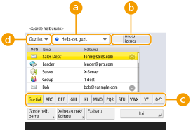 Hainbat helmuga erregistratu nahi badituzu edo horiek sailkatu nahi badituzu sail edo enpresako bazkideen arabera, erregistratu horiek helbide-liburuan. Helbide-liburuak aukera ematen dizu helmugak bilatzeko izenaren lehenengo karakterearen arabera edo helmuga-mota hautatuz; esaterako, faxa edo posta elektronikoa. Helmugak erregistra ditzakezu erabiltzaile guztientzat, helmugak zure erabilerarako, eta administratzaileak soilik edita ditzakeen helmugak. Helmugak erregistratzea helbide-liburuan