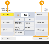ניתן להגדיל או להקטין את הגודל על ידי ציון יחס הצילום (%). ניתן לציין יחסי אופקי ואנכי בנפרד.