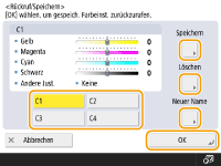Sie können bis zu vier Einstellwerte nach der Einstellung registrieren. Nach Einstellung der Farbe drücken Sie <Rückruf/Speichern> wählen Sie eine Taste zwischen <C1> und <C4> drücken Sie <Speichern> <Ja> <OK>.![]() ![]() Zum Aufrufen der registrierten Einstellungen drücken Sie <Rückruf/Speichern>, wählen Sie eine Taste, und drücken Sie <OK>. Sie können die Tastennamen von <C1> bis <C4> ändern. Wählen Sie die zu ändernde Taste, drücken Sie <Neuer Name>, und geben Sie einen neuen Namen ein. Zum Löschen der registrierten Einstellungen wählen Sie die Taste drücken Sie <Löschen> <Ja>. |