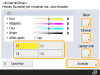 Podeu desar fins a quatre opcions després de l'ajustament. Un cop ajustat el color, premeu <Recuperar/Desar>