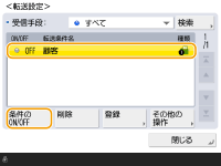 I ファクスの転送条件や<ナンバーディスプレイ設定>を<ON>にしているときは、選択項目が一部変わります。 I ファクスの転送先にWebDAV サーバーは設定できません。 <送信前に確認画面を表示>を有効にした宛先を転送先として指定したときは、パスワードを入力する画面は表示されません。登録したパスワードを使用して、そのまま転送されます。宛先を登録する 転送エラーになった文書は<転送エラージョブの処理>の設定にしたがって処理されます。 転送設定は、最大1000件まで登録できます。 |