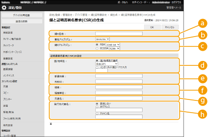 本機で自己生成した証明書は認証局の署名がないため、通信相手によっては通信エラーとなってしまうことがあります。認証局の署名が付いた証明書を発行してもらうためには、証明書署名要求(CSR:Certificate Signing Request)のデータが必要です。CSRは、管理者がリモートUIから生成することができます。