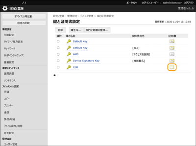 CSRを生成した鍵は、鍵と証明書の一覧画面に表示されますが、このままでは使用することができません。この鍵を使用するには、CSRを基に発行された証明書を登録する必要があります。 鍵に証明書を登録する |