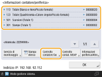 È possibile stampare un elenco che mostra il numero di pagine usate per la copia, la stampa, la scansione e i fax. È possibile verificare anche le informazioni contatore per ogni MEAP. Premere <Controllo contat. MEAP> nella schermata del passaggio 2. Se si preme <Informazioni periferica/Altro> <Contr. config. periferica> nella stessa schermata, è possibile verificare le opzioni installate nella macchina.Per informazioni sulle condizioni di conteggio, contattare il rivenditore o il rappresentante di servizio. Per informazioni sul <Servizio di monitoraggio>, contattare il proprio rivenditore o il rappresentante dell’assistenza. |