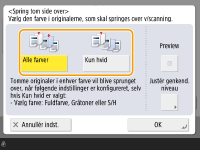 For at springe over tomme originaler uanset deres farve skal du vælge <Alle farver>. For kun at springe over hvide originaler skal du vælge <Kun hvid>.
