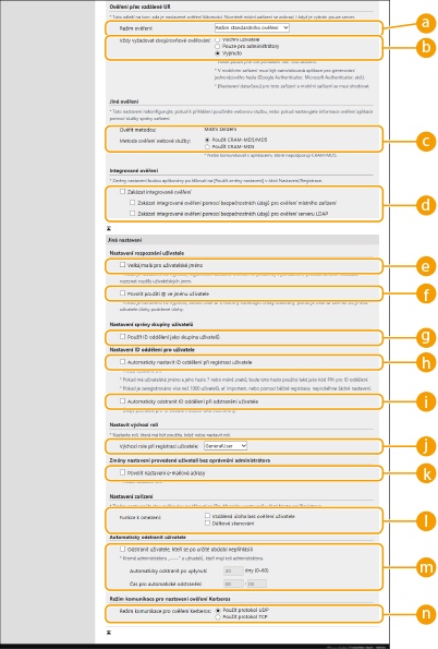 Chcete-li deaktivovat funkci integrovaného ověření přístupových práv pouze pro přihlášené uživatele zaregistrované na serveru LDAP, zaškrtněte políčko pro [Zakázat integrované ověření pomocí bezpečnostních údajů pro ověření serveru LDAP].