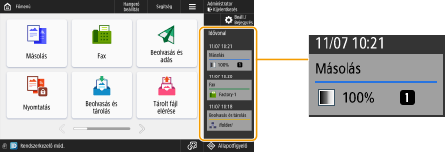 Az automatikusan hozzáadott előzmény törléséhez, vagy az előzmény beállításainak a <Főmenü> képernyőn való tárolásához Személyes gombként/Megosztott gombként nyomja meg és tartsa nyomva az előzményt. Azonban a <Jóváhagyási képernyő mutatása újrahíváskor> és <A visszahívási művelet indítása (A művelet a gomb megnyomásakor indul.)> lehetőséget nem állíthatja be a Személyes gomb/Megosztott gomb bejegyzésekor az idővonalról. A Személyes gombok/Megosztott gombok bejegyzése