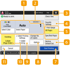 وضعیت تنظیم را (مانند اندازه کاغذ برای چاپ روی آن و تعداد چاپ) را نمایش میدهد. برای چاپ درست، حتماً تنظیمات را تأیید کنید. برای تغییر تنظیمات، دکمه موجود در پایین بخش نمایش را فشار دهید. برای تغییر تعداد چاپ، تعداد چاپها را با استفاده از کلیدهای عددی وارد کنید.