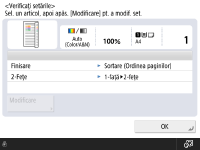 Dacă opțiunea <Sortare automată> este setată la <Pornit>, modul de sortare este setat automat când așezați originalele în alimentator. <Sortare automată>