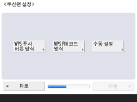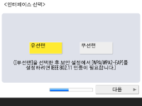 네트워크에 기기를 연결하는 방법을 지정합니다. ![]() ![]() 기기를 컴퓨터 등에 연결하는 방법을 선택할 수 있습니다. 사용할 연결 방법을 선택하고 <다음>을 누릅니다. <유선랜>을 선택한 경우 7단계로 진행합니다. 네트워크 연결 방법에 대한 자세한 내용은 네트워크 연결 방법 선택을 참조하십시오. ![]() <무선랜>을 선택한 경우 무선 LAN 설정을 지정합니다. ![]() 무선 LAN 연결에 대한 자세한 내용은 무선 LAN에 연결을 참조하십시오. | |