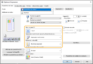 Lors de la vérification de l'aperçu d'impression, réglez [Mise en page] [Ordre des pages] [Impression recto/recto verso/au format brochure] [Emplacem. Reliure].