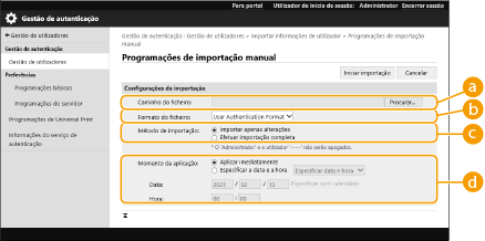 Se selecionar [Efetuar importação completa] e um usuário com o mesmo nome de usuário já estiver registrado, as informações do usuário serão sobrescritas.