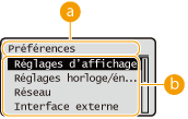 Sélectionnez <Régler> pour afficher l'écran <Menu>. De nombreux paramètres de la machine, tels que les paramètres de gestion, les paramètres d'affichage et les paramètres réseau, sont configurés en premier lieu en sélectionnant <Régler>.