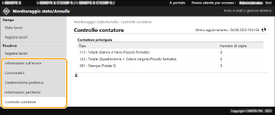 È possibile verificare un gran numero di informazioni sulla macchina, ad esempio informazioni sugli errori, quantità di carta e toner rimanenti, informazioni sulle apparecchiature opzionali collegate e numero totale di pagine che sono state stampate finora.