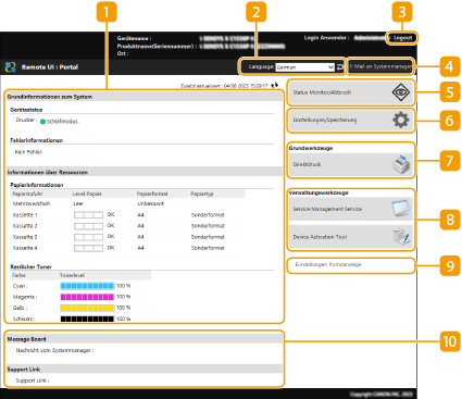 Einige Anzeigeelemente und Funktionen sind nur verfügbar, wenn Sie sich mit Administratorrechten anmelden. Wenn mehrere Benutzer gleichzeitig mit dem Remote UI arbeiten oder das Bedienfeld der Maschine gleichzeitig mit dem Remote UI bedient wird, ist der zuletzt ausgeführte Vorgang wirksam. |