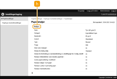 [Navn]Viser [Papirdetaljer] når du klikker på papirtypen som vises i [Navn]. Hvis du velger en egendefinert papirtype, kan du redigere den.