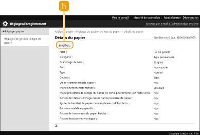[Modifier]S'affiche à l'écran [Détails du papier] pour le type de papier personnalisé et vous permet de modifier les réglages pour l'élément sélectionné.