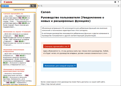Страница списка поискаПоиск по ключевому словуПри поиске с помощью ввода версии в качестве ключевого слова (например, «Ver. 05.13») отображается список страниц, включающих это ключевое слово. Затем можно выполнить поиск по перечисленным страницам. |