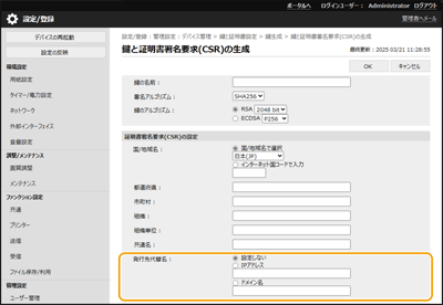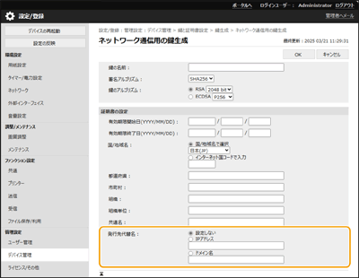 リモートUIでネットワーク通信用の鍵を生成するとき、[発行先代替名]が設定できるようになりました。
