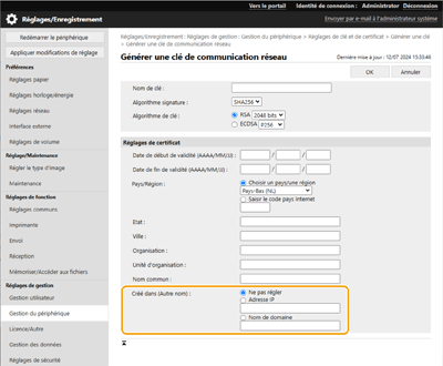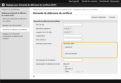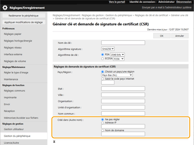 [Créé dans (Autre nom)] peut être défini lors de la génération d’une clé et d’une demande de signature de certificat (CSR) à l’aide de l’interface utilisateur distante.