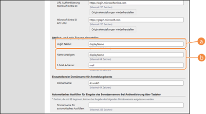 4 | Geben Sie Attribute an. ![]() [Attribut, um Login-Zugang einzustellen] Geben Sie die Attribute für den Anmeldenamen, Anzeigenamen und die E-Mail-Adresse des jeweiligen Benutzerkontos auf dem Server ein. [Login-Name:]Wählen Sie aus dem Pulldown-Menü das Attribut für den Anmeldenamen der einzelnen Benutzerkonten auf dem Server aus. * Wenn Sie ein Attribut angeben wollen, das nicht im Pulldown-Menü angezeigt wird, können Sie es direkt eingeben. [WindowsLogonName]: Den „displayName“ erhalten Sie von Microsoft Entra ID. Der „displayName“ wird wie folgt geändert, um den Anmeldenamen zu erstellen: