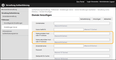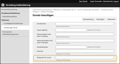 5 | Geben Sie den Domänennamen des Anmeldeziels in [Domänname:] unter [Einzustellender Domänname für Anmeldungskonto] an. | ||