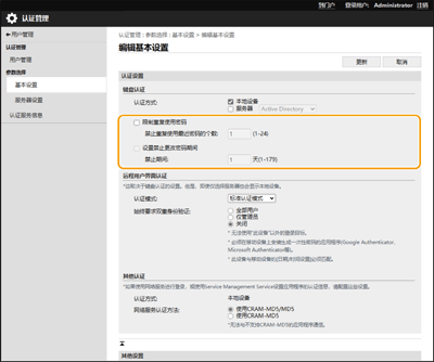 现在,可以禁止用户在更改密码时使用已经使用过的密码。选中[限制重复使用密码]复选框,并配置密码历史计数以匹配此设置。