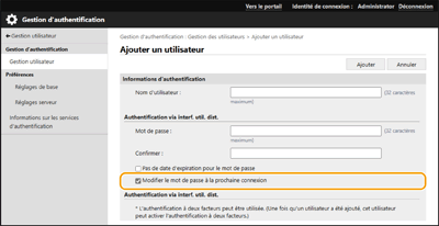 Il est désormais possible d’obliger les utilisateurs à modifier leur mot de passe lors de leur première connexion. Cochez cette case pour obliger les utilisateurs enregistrés à modifier leur mot de passe. Une fois qu’un utilisateur a modifié son mot de passe, la case à cocher est automatiquement supprimée.