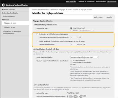 Vous pouvez désormais interdire l’utilisation d’un mot de passe qui a déjà été utilisé, lorsque les utilisateurs changent leur mot de passe. Cochez la case [Restreindre la réutilisation de mots de passe], et configurez le compte de l’historique des mots de passe en fonction de ce paramètre.