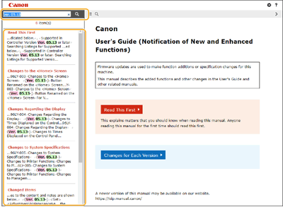 Pesquisar página de listaBusque por palavra-chavePesquisar inserindo a versão como uma palavra-chave (por exemplo, “Ver. 05.13”) exibe uma lista de páginas que incluem essa palavra-chave. Então, você pode pesquisar nas páginas listadas. |