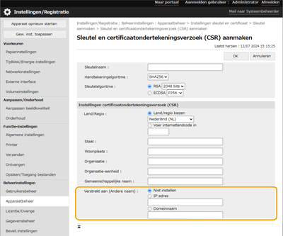 [Verstrekt aan (Andere naam)] kan worden ingesteld wanneer u een sleutel en een certificaatondertekeningsverzoek (CSR) genereert met UI op afstand.