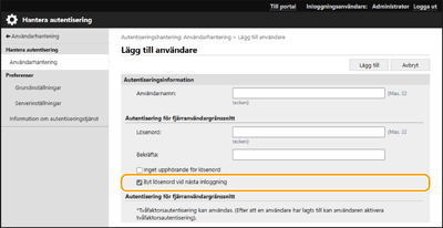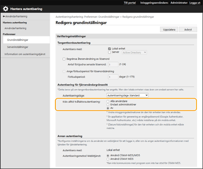 Du kan nu kräva att registrerade användare utför tvåfaktorsautentisering när de loggar in på fjärranvändargränssnittet. Markera kryssrutan för att kräva tvåfaktorsautentisering.