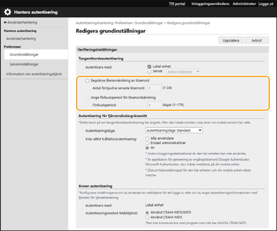Du kan nu förbjuda användning av ett lösenord som redan har använts när användare ändrar sitt lösenord. Markera kryssrutan [Begränsa återanvändning av lösenord] och konfigurera antalet lösenordshistorik för att matcha denna inställning.