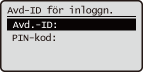 När Hantering av avdelnings-ID inte är aktiveratOm bara systemansvarigs ID och PIN-kod har angetts utan Hantering av avdelnings-ID behöver du bara logga in på maskinen om du vill konfigurera inställningar som kräver administratörens godkännande. Ange ID och PIN-kod i <Systemansvarigs-ID> och <PIN för systemhant.> och tryck på . |