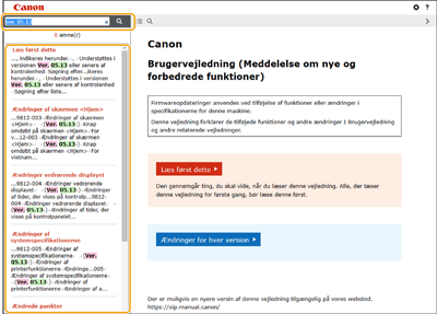 Søg på listesideSøg med søgeordSøgning ved indtastning af versionen som søgeord (eksempelvis ”Ver. 05.13”) viser en liste med sider, der indeholder det søgeord. Du kan derefter søge de opstillede sider igennem. |