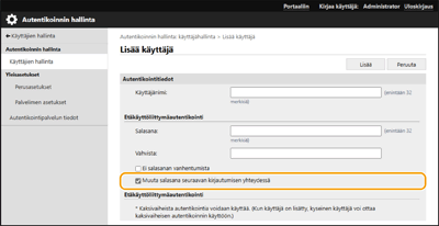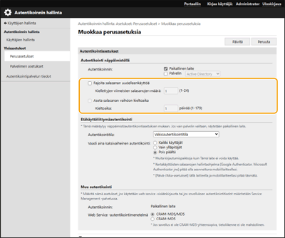 Nykyään voi määritellä ajanjakson, jolloin käyttäjät eivät pysty muuttamaan salasanojaan. Rastita [Aseta salasanan vaihdon kieltoaika] -valintaruutu ja määrittele myös kieltoajanjakso.
