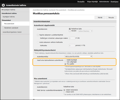Nykyään voi vaatia, että rekisteröityneet käyttäjät suorittavat kaksivaiheisen todennuksen kirjautuessaan etäkäyttöliittymään. Rastita valintaruutu, jos haluat vaatia kaksivaiheisen todennuksen.