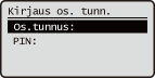 Kun Osastotunnusten hallinta ei ole käytössäKun ainoastaan järjestelmänvalvojan tunnus ja PIN on asetettu ilman osastotunnusten hallintaa, laitteeseen on kirjauduttava vain silloin, kun halutaan määrittää asetuksia, jotka vaativat pääkäyttäjän valtuuksia. Anna tunnus ja PIN kohdissa <Järjestelm. valv. tunnus> ja <Järj.valvojan PIN>, ja paina . |