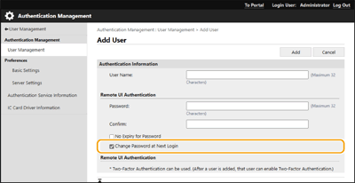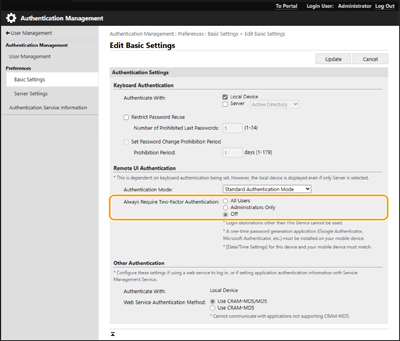 Nüüd saate nõuda registreeritud kasutajatelt Remote UI-sse (Kaugkasutajaliides) sisselogimisel kaheastmelist autentimist. Kaheastmelise autentimise nõudmiseks märkige see ruut.
