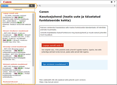 Otsinguloendi lehtMärksõna järgi otsimineKui otsite, sisestades versiooni märksõnana (nt „Ver. 05.13“), kuvatakse seda märksõna sisaldavate lehekülgede loend. Seejärel saate loetletud lehtedelt otsida. |