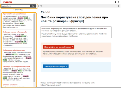 Сторінка списку пошукуПошук за ключовими словамиПошук за допомогою введення версії як ключового слова (наприклад, «Версія 05.13») відображає список сторінок, які містять це ключове слово. Потім можна здійснювати пошук у перелічених сторінках. |