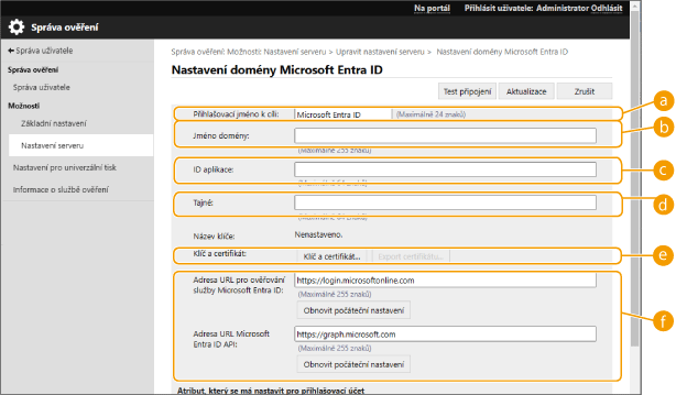 [Adresa URL pro ověřování služby Microsoft Entra ID:] a [Adresa URL Microsoft Entra ID API:]Zadejte adresy URL. V závislosti na vašem cloudovém prostředí může být nutné změnit nastavení.